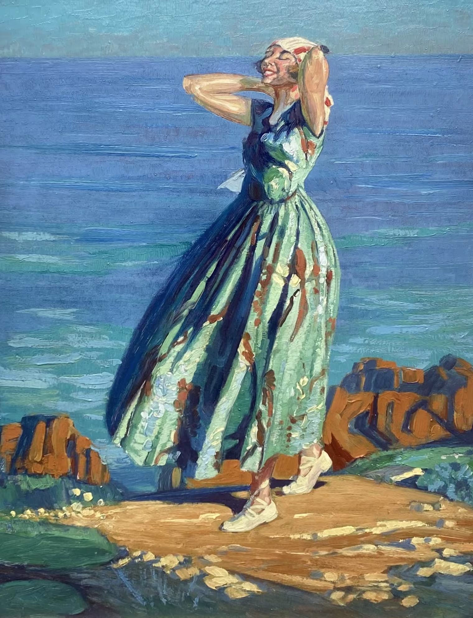 Aubry’s ‘Holiday in Esterel’ beholds all the style and flair associated with the 1920’s. There is an Art Deco panache in the way the lady’s bold and elegant figure strikes out against the bright blue of the sea.
